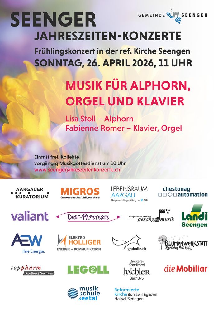 Die Seenger Jahreszeiten-Konzerte finden viermal jährlich statt, Im Sommer, Herbst, Winter und im Frühling. Das Programm reicht von Klassischer Musik über Jazz bis hin zu Weltmusik. Alle Konzerte finden in Seengen statt.
